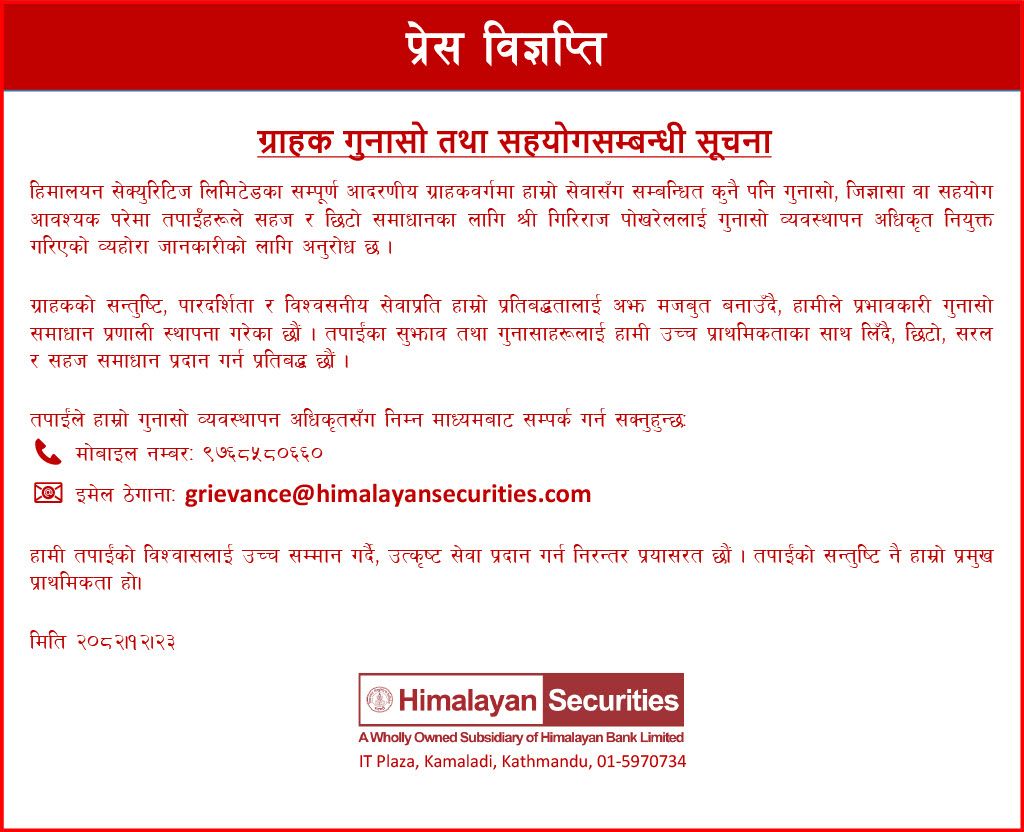 Branch: Kamaladi Account Name: Himalayan Securities Limited Account Number: 30101010004978